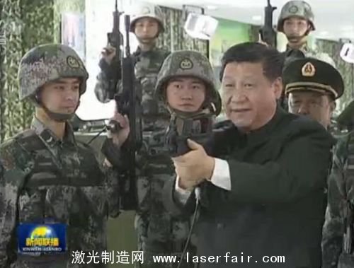 習近平在激光模擬射擊系統前拿起步槍體驗射擊要領,摳動扳機擊中目標