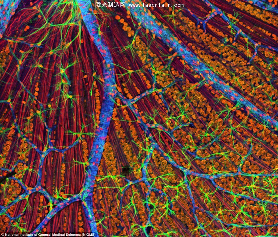 激光掃描顯微鏡會逐點掃描樣品表面,并將一個個像素的信息最終合成一副完整圖像,這樣就能得到一副三維立體的高分辨率圖像。這里展示的是老鼠的視網膜,其中的細胞已經經過染色以便顯示不同結構的細節?! ?/p>