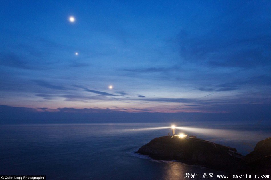 幾個世紀以來,燈塔一直幫助確保海上水手們的安全,它照亮了狂暴的海面,指示危險的礁石。這張照片拍攝于英國威爾士西海岸附近,展示出這種傳統的美感。在這張圖像中,天空中從左上到右下分別是金星,木星和月球。