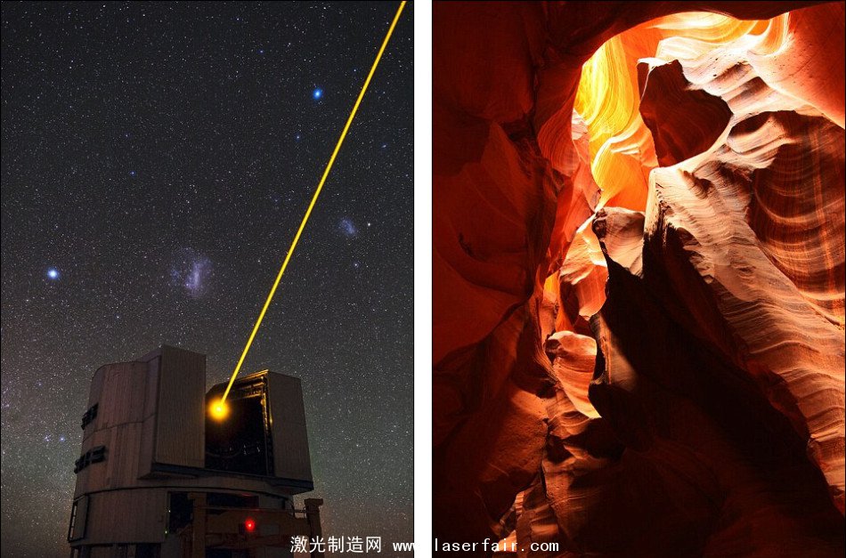 所有激光的原理都在于控制原子釋放光子的方式。激光可以讓光的能量集中在很小的范圍內并照射到相對遙遠的目標。在左圖中,天文學家們利用激光測量地球大氣層擾動,從而為望遠鏡修正光學誤差作為參考;而右圖展示的則是美國亞利桑那州的羚羊峽谷(Antelope Canyon)