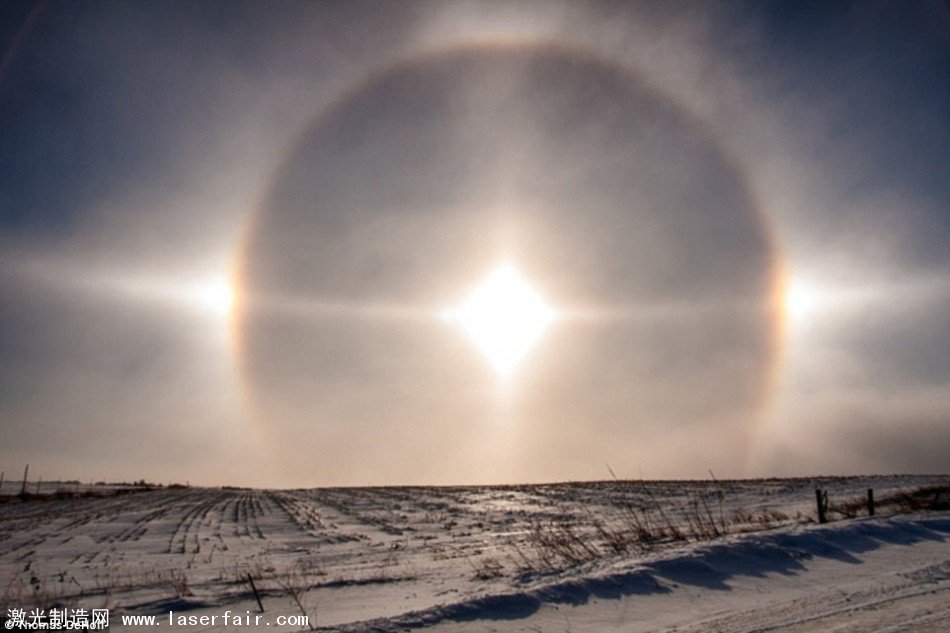 這張照片展示的是所謂“幻日”現象,此時太陽的兩側都分別出現了兩個明亮的點,這種光學現象比較多會發生在日落時分。這主要是由空氣中的冰晶彎曲陽光后導致的結果,這些冰晶是棱鏡狀的。如果這些冰晶在大氣中的朝向是隨機的,那么太陽周圍就會出現一個完整的圓形?! ?/p>