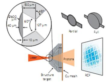 圖10 實(shí)驗(yàn)設(shè)置和目標(biāo)靶。錐靶由10微米厚的球殼層和鋁錐體組成,銅網(wǎng)格和成像板分別