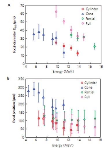 實(shí)驗(yàn)使用了Los Alamos 國(guó)家實(shí)驗(yàn)室的TRIDENR亞皮秒激光器,激光功率為200TW。如圖10所示,F(xiàn)I結(jié)構(gòu)由高密碳膜制成的部分球表面箔層和60°錐體或圓柱體結(jié)構(gòu)組成,在箔層表面上的碳?xì)鋵幼鳛橘|(zhì)子束的發(fā)射源。同時(shí),實(shí)驗(yàn)還對(duì)部分球表面箔層和半球面箔層的結(jié)果進(jìn)行了對(duì)比。發(fā)射出的質(zhì)子束將首先通過(guò)一層銅網(wǎng)格,而后由一系列成像板(RCF)記錄下其網(wǎng)格模式,每一塊RCF都只能記錄一定能量范圍內(nèi)的質(zhì)子束。利用這些數(shù)據(jù),結(jié)合3D軌跡追蹤技術(shù),可以反推出質(zhì)子束的最小橫向直徑D(即焦斑直徑)和聚焦位置。實(shí)驗(yàn)發(fā)現(xiàn)如圖11所示,焦斑直徑隨著質(zhì)子束能量的提高而減小,同時(shí),部分球表面箔層的結(jié)果也顯著優(yōu)于半球面箔層的。就焦點(diǎn)位置而言,錐體結(jié)構(gòu)是其他結(jié)構(gòu)對(duì)應(yīng)位置的2~3倍遠(yuǎn)(300微米)。