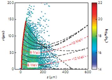 圖12 測(cè)試質(zhì)子的模擬結(jié)果。曲線為質(zhì)子的運(yùn)動(dòng)軌跡,顏色反映質(zhì)子的密度
