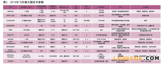 在撰寫這篇文章時,我們與所有參加了2013年調查的公司進行了聯系,并請他們更新了數據。此外,許多不在之前名單上的公司也被邀請參與此次調查,2013年調查時他們或是沒有囊括入名單中,或是不愿意參與,或是當時他們還沒有涉足超短脈沖激光器領域。因此本次的名單更為完整,但這絕不是一個完整的調查。名單被劃分為皮秒激光器和飛秒激光器;公司在表中的位置是由他們自己選擇的。