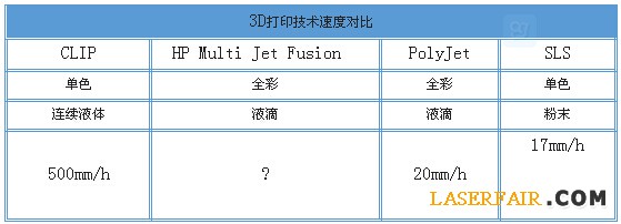 Multi Jet Fusion的噴頭陣列就是大大提高速度的秘密。并且,“10倍速”這個數據在惠普實驗室中通過與SLS和FDM技術的測試對比,已經被驗證。那么25-100倍速的CLIP,是不是遠遠快于惠普的Multi Jet Fusion技術呢?我們看這個表格。