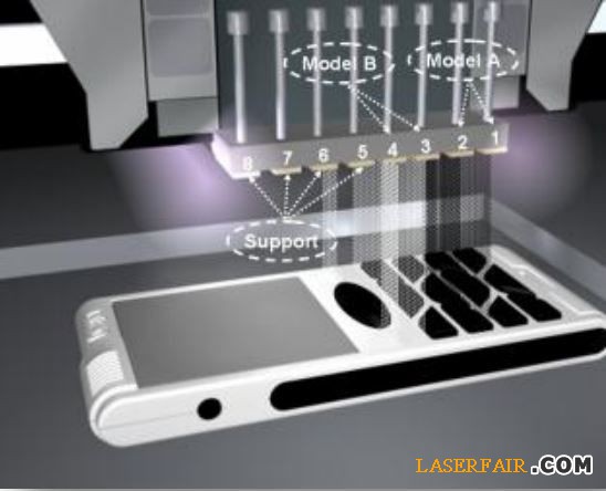Stratasys PolyJet技術示意 1到8號表示8個噴頭組成了噴頭模組