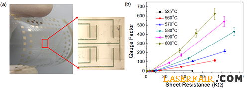 圖1.(a)人造電子皮膚。(b) 在不同生長溫度下GF 隨表面電阻的增加而增大。