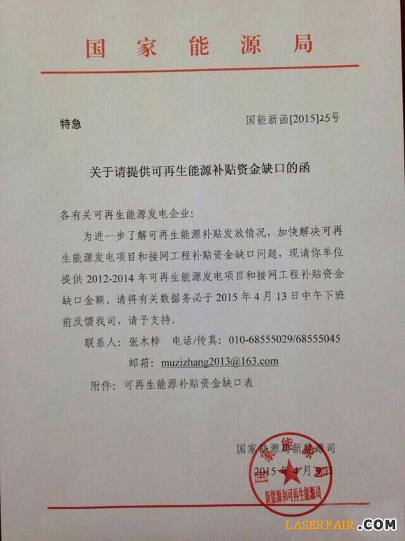 2015年4月9日,國家能源局向各有關可再生能源發電企業發布【特急】關于請提供可再生能源補貼資金缺口的函?! 『赋觯簽?/p>