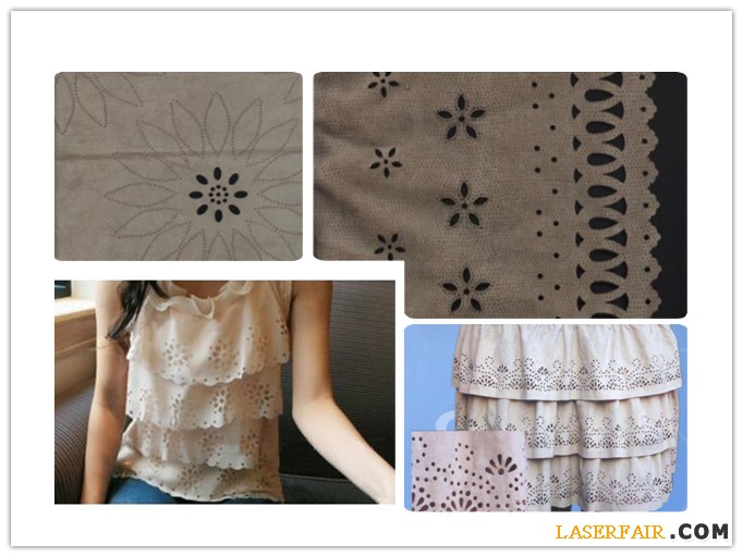 服裝激光燒花就是利用激光切割機激光的高能量密度特性,投射到服裝材料表面,將材料汽化,并在服裝材料表面產生清晰外形的加工