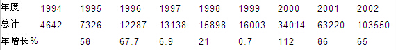 表2 1994-2002年中國國內(nèi)激光加工系統(tǒng)銷售額(萬元人民幣)