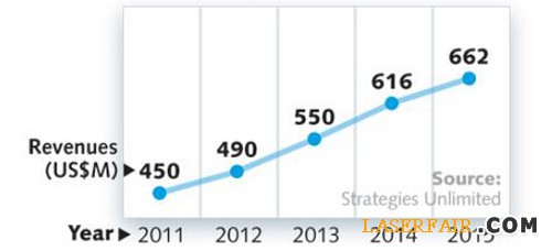 隨著激光影院市場的滲透和激光標識游戲的多樣化,激光照明顯示市場的營業收入持續固定增長。事實上,許多城市正在考慮“消滅”污染,即煙花匯演產生的固體垃圾也將有利于激光燈光秀的發展。隨著所有激光娛樂市場的發展,我們預測2015年娛樂和顯示應用的激光市場將增長近11%達到1.97億美元。