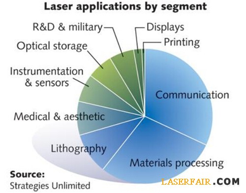 通信和光存儲仍然是激光產業最大的細分市場,然后是材料加工和光刻激光器市場部分。在2014年,醫療和美容激光產品銷售總額仍然大于儀器和傳感部分,最后是科研和軍事細分市場。