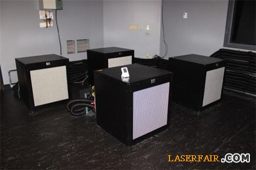 不過,這套4K激光IMAX投影系統(tǒng)也需要用到大功率的冷卻設(shè)備。圖中的這四個盒子和一套黑色的皮管便是它們最主要的冷卻工具。
