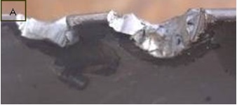 從圖2 A中看出,葉片的局部受損部位已經進行了疲勞層去除處理,處理后的表面起伏不平,不規則度很大。若使用傳統的修復技術很難獲得致密平整的填充效果,而激光熔覆技術是一種非接觸式加工,在一定的范圍內不會受制于工件形狀或尺寸的影響。圖2 A中的受損部位具有較深豁口,故需要多道多層搭接。激光熔覆技術在應用中的常見問題便是裂紋的滋生,多道多層的搭接會增發應力變化的復雜性,不利于從工藝角度控制裂紋的生成。因此在熔覆過程中,可通過調整光斑大小、掃描速度、激光功率來盡量在最少搭接道數目以及最少搭接層下完成豁口的修復,如圖2 B中便是修復后的葉片,經過性能檢測,完全滿足其服役性能要求。