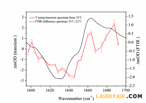 翁羽翔研究組長期致力于脈沖升溫納秒時間分辨紅外光譜技術的發展及其在蛋白質動態結構方面的應用研究。該課題組與大連理工大學教授于清旭開展長期合作,于2005年建立了基于國內一氧化碳氣體中紅外激光技術的寬譜帶脈沖升溫-時間分辨瞬態光譜儀(測量精度為千分之一的吸光度差10^-3,Chin.Phys.2005,14,2484),并用于蛋白質動態結構的研究,取得了系列成果(Biophysical Journal,2007,93,2756-2766;2009,97,2811-2819;Scientific Reports,2014,4,4834)。在前期大量工作的基礎上,該課題組意識到只有將已有設備的測量精度再提高一個數量級,即到達萬分之一的吸光度差(10^-4)之后才能滿足普適性要求,由此對脈沖升溫光源和一氧化碳氣體紅外激光光源提出更高的要求。
