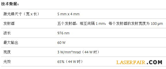 歐司朗光電半導體從光束質量方面優化了新款SPLBF98-40-5激光棒的芯片設計。優化的結果,是打造出一款波長為976nm且具有高亮度(激光器光束質量的衡量標準)的激光器。光輸出為44W時,這款激光器的亮度達到3W/mm*mrad,實現了無與倫比的組合。SPLBF98-40-5激光棒寬5mm,由五個發射器組成,每個發射器寬100μm且腔長為4mm。