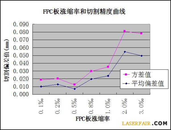FPC板漲縮率和切割精度曲線圖表明,當漲縮率小于0.8‰,切割精度在±0.05mm范圍內波動。隨著漲縮率的增大,平均切割偏差值和方差值都增加,當漲縮率大于0.8‰時,切割精度達不到±0.05mm的客戶要求。