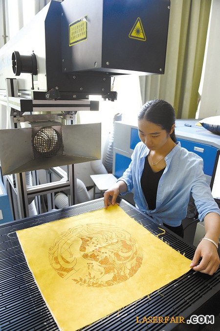 圖為激光雕刻現場。 布料上做花型,不外乎印花、提花、繡花,可是現在浙江紡織服裝職業技術學院紡織學院的學生們卻來了個創新