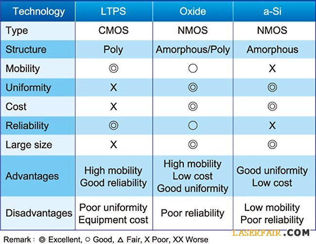 常見的氧化物半導體如氧化銦鎵鋅(InGaZnO),是一種電子移動率可達10平方厘米(cm2)/VS的新材料,為傳統非晶矽(<1cm2/VS)的數十倍以上。加上非晶(Amorphous)結構可以在大尺寸獲得良好的均勻度,適合應用在大尺寸面板,達到高清晰度、低能耗、低漏電的優點,但其可靠度不??佳以及PMOS制造工藝困難一直是亟待改善的技術,前者是量產商品化必須克服的重要關鍵,后者可用補償電路(Compensation Circuit)加以克服。