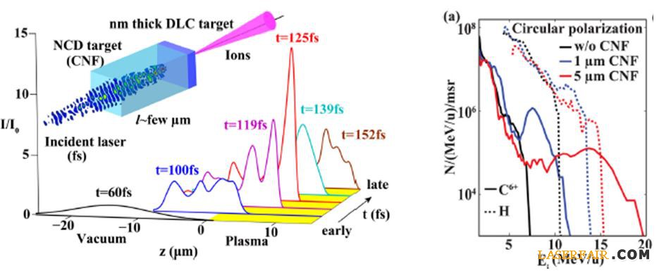 激光在納米管等離子體透鏡中的整形過程(左)和離子能譜圖(右)