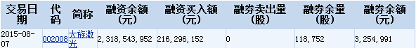 大族激光2015-08-07融資融券信息顯示,大族激光融資余額2,318,543,952元,融資買入額216,296,152元,融券賣出量0股,融券余