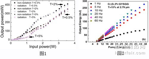 圖1 100 Mrad γ射線輻照前后Yb,Er,Ho:GYSGG的激光輸出功率曲線; 圖2 Cr,Er,Pr:GYSGG晶體在1~60Hz重復頻率下的激光特性曲線