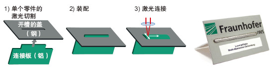 生產具有良好力學性能的復合零部件需要借助全新的連接方法,特別是在激光應用方面。用選擇性激光熔化實現的鋼鋁復合插槽(web-slot)連接是一種解決方案。為了實現直接的連接工藝,特別是復合的T型接頭,必須將長距離激光控制工藝與一種新的一體化設計方法結合起來。可以通過選擇性熔化工藝來避免金屬間化合物的形成。其中包括通過高度控制的長距離激光工藝來對低熔點材料進行選擇性熔化。具體而言,鋁材這一邊的接頭設計需要加以調整。為了達到這個目的,開發出了用于T型接頭的可以用激光實現的插槽結構設計(圖3)。