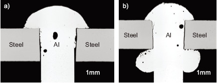 通過優化長距離激光工藝,可以實現不同形狀的接頭。基本上,能通過調整掃描寬度、掃描速度和激光功率來確保只熔化鋁材這一面(圖4a)。此外,單邊激光工藝的優化還允許雙面鋁材裝配的塑形(圖4b)。金相分析表明在鋼和鋁之間的邊界地區會形成較小的不會帶來影響的金屬間化合物相。在與強度相關的交叉部分(“激光鉚釘頭”)中,沒有檢測到鐵的內容物。