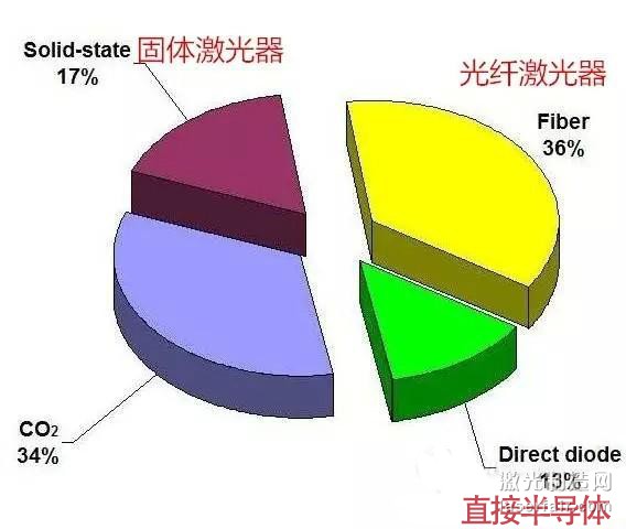 圖1:主要工業激光器市場份額,光纖激光器已超過CO2激光器份額。超過60%的激光驅動材料加工市場是基于高功率GaAs半導體技術。