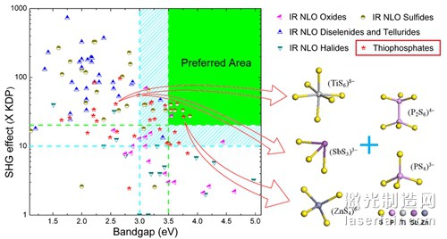 優(yōu)質(zhì)的中紅外激光變頻材料,需要達(dá)到激光變頻效應(yīng)(倍頻系數(shù)dij)和抗激光損傷閾值(對應(yīng)帶隙Eg)的平衡,即位于如圖的綠色區(qū)域(Eg > 3.5 eV, dij > 20 × KDP)。迄今為止,大部分已發(fā)現(xiàn)的材料都無法達(dá)到此要求。課題組研究人員首次系統(tǒng)地搜索了所有具有無心結(jié)構(gòu)的M-N-P-S型金屬-硫磷化物(M為堿金屬堿土金屬陽離子;N為中心配位陽離子),他們按照材料的微觀基團(tuán)配位環(huán)境將此化合物體系分成四類,分別包含孤立的P-S基團(tuán)、二階姜泰勒效應(yīng)的陽離子、孤對電子效應(yīng)的陽離子、以及短半徑低配位的陽離子等。經(jīng)過對這些“材料基因”信息的預(yù)測和分析,他們揭示具有孤立硫磷基團(tuán)的體系的光學(xué)各項(xiàng)異性不能滿足中紅外變頻的要求;而具有二階姜泰勒效應(yīng)和孤對電子效應(yīng)的體系帶隙較低(Eg< 3 eV),也難以實(shí)現(xiàn)Eg和dij的平衡。與之對比,具有短半徑低配位陽離子的體系,可以呈現(xiàn)Eg和dij很好的平衡(位于圖中的綠色區(qū)域),能夠較好地滿足優(yōu)秀中紅外非線性光學(xué)晶體的性能條件。