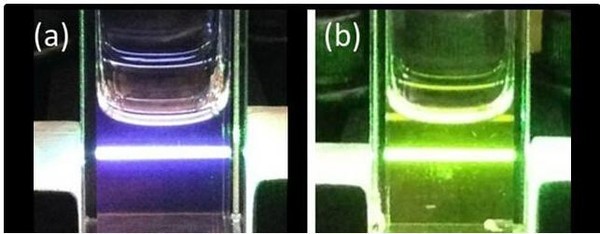 圖片說(shuō)明:(a)當(dāng)一束綠色激光照射到包覆有機(jī)材料的硒化鎘上時(shí),它會(huì)轉(zhuǎn)化為更高能的光;(b)而照射到包覆著其他材料的硒化鎘上時(shí),光將直接通過(guò)。