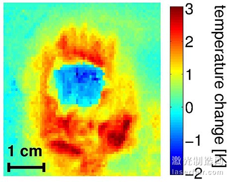 這張紅外照片顯示的是用激光進行冷卻后的氣體(藍色)以及它四周的金屬間(紅色和黃色)的溫度變化。在用一特種激光束進行了30秒的脈沖照射后,與它的容器相比,氣體的溫度下降了幾度。