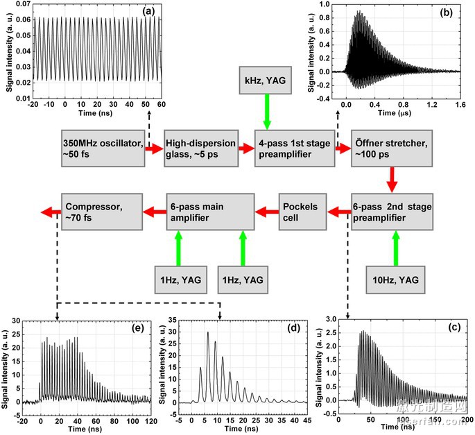 圖1. 激光系統(tǒng)的結(jié)構(gòu)示意圖和飛秒脈沖序列在不同放大階段的光電二極管信號(hào)。(a)振蕩器信號(hào);(b)第一預(yù)放大器后;(c)第二預(yù)放大器后;(d)主放大器的兩路泵浦激光同時(shí)抽運(yùn)時(shí)的脈沖序列輸出;(e)主放大器的兩路泵浦激光輪流抽運(yùn),并對(duì)其相對(duì)延時(shí)進(jìn)行優(yōu)化后得到的均勻脈沖序列。