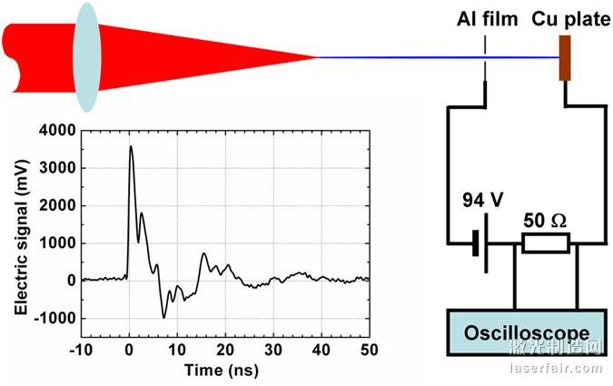 圖2. 在等離子體通道的兩端加載直流電壓后得到的電流信號(hào),電流持續(xù)時(shí)間反映了等離子體通道的壽命(約80ns).