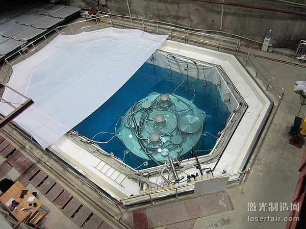 據介紹,大亞灣實驗是一個中微子“消失”的實驗,它通過分布在三個實驗大廳的8個全同的探測器來獲取數據。每個探測器為直徑5米、高5米的圓柱形,裝滿透明的液體閃爍體,總重110噸。周圍緊鄰的核反應堆產生海量的電子反中微子,近點實驗大廳中的探測器將會測量這些中微子的初始通量,而遠點實驗大廳的探測器將負責尋找預期中的通量減少。