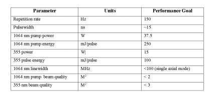 激光器設(shè)計方案原本是工作在50Hz的15W紫外激光器。作為項(xiàng)目的一部分,我們會定期和ESTO贊助商和其他雷達(dá)系統(tǒng)相關(guān)開發(fā)人員溝通審核,根據(jù)他們提供的激光器輸入數(shù)據(jù)我們最終改變設(shè)計為1064nm泵浦激光器,工作頻率150Hz,同時仍保持40W的平均功率輸出。在355nm的UV平均功率最終目標(biāo)仍然是15W。