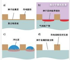 圖4:在種子金屬層上鍍上導電結構(a)。準分子激光的能量被種子層和金屬結構吸收。較厚的金屬結構會傳播能量,并且不會被燒蝕。薄的種子層不能足夠快地分散能量,它造成的分子振動和熱量到達聚合物界面(b)。聚合物的化學鍵被破壞,并產生了氣體副產物和壓力。激光脈沖產生的沖擊波加上氣體壓力會吹掉聚合物表面上的種子金屬層(c)。種子金屬層被完全去除,但是導電結構仍然保持完好無損(d)。
