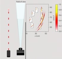 該攝像頭采用回聲定位技術,定位盲區(qū)附近的物體。同時,其先進的攝像頭模塊非常敏感,它可以跟蹤單個光子的光。系統(tǒng)會向周圍發(fā)射數百萬的脈沖波,當這些脈沖波到達地面后會以球狀波發(fā)散出去,碰到障礙物后會再反射回來,當這些反射回來的光出現在攝像頭的“視線”范圍內,通過計算來回的時間,就可以判斷出障礙物的位置。攝像頭以200 億幀/秒的速度進行拍攝,位置的精確度能達到厘米。