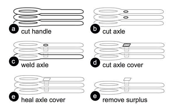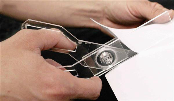 那么,它是如何工作的呢?嗯,用戶只需將一堆亞克力板放進切割機里。“在加工過程中,LaserStacker通過切割每一層來成型,并通過熔融其接觸面處的材料將各層焊結在一起,并在更高的層數上修復不需要的切割。當用戶從激光切割機中拿出對象時,它已經組裝好了。”Udayan Umapathi解釋說。下圖以制作一把剪刀為例,展示了這個相當簡單而巧妙地過程。