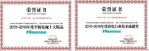 12月23日,在中國電子商會、工信部電子技術標準化研究院共同主辦的“2015年中國平板電視行業大會”上,海信65英寸XT910系列ULED電視憑借突出的技術優勢和優異的市場表現被評為“2015-2016年度平板電視十大精品”第一名;海信100英寸旗艦版激光影院電視則摘得“2015-2016年度彩電行業技術成就獎”,海信ULED和激光影院電視成為2015年度中國彩電市場上最出彩的兩大旗艦產品。