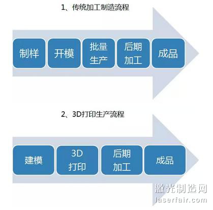 我們知道3D打印是一種全新的產品生產制造方式,有別于傳統的生產制造;傳統行業基本上都是減材制造或等材制造,3D打印則是增材制造。制造方式的不同必定造成具體的生產流程上的極大不同。