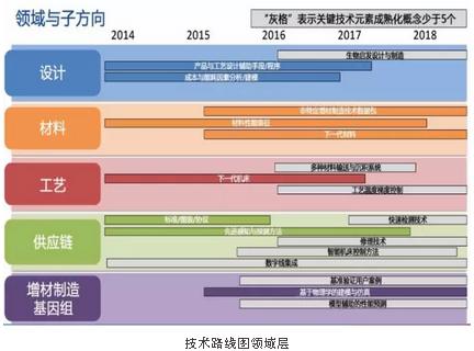 材料。包含3個子方向:“非特定”增材制造技術包,材料性能表征,下一代材料。旨在圍繞增材制造性能表征基準,構建知識體系,消除成品材料性能的波動。材料領域要構建一個范本,以微尺度層面上對增材制造工藝的物理學控制,代替工藝參數和成品微結構控制,完全按照設計實現一致的、可重復的產品微結構和性能。領域關注點和相關影響分析指標包括:標準化的原材料,基準材料性能數據,“工藝-性能-結構”關系,工藝窗口邊界定義,后處理指南與規范。