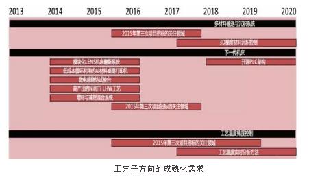 工藝。包含3個子方向:多材料輸送與沉積系統,下一代機床,工藝溫度梯度控制。旨在提升增材制造機床的速度、精度和細節分辨率,并且適應大批量生產,提高成品零件質量。工藝領域要開發“機床級”工藝性能提升所需的關鍵技術和相關子系統,類似于柔性制造系統。領域關注點和相關影響分析指標包括:制造速度,精度,細節制造能力,表面質量,最大零件尺寸。