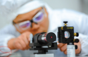 在寧波中物激光與光電技術研究所的超凈間光學實驗室,科研人員正在進行激光光斑聚焦調節。