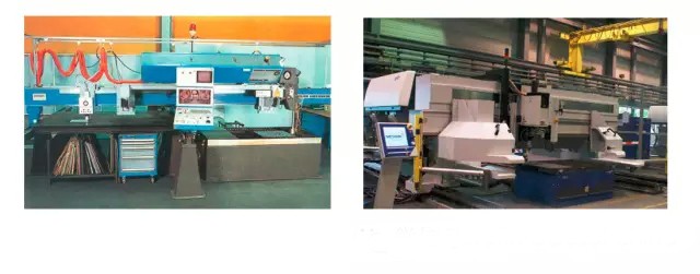 圖4:七十年代初期的Messer切割系統:激光源傾斜45°。這使得用戶通過使用一個相移延遲90°的光束彎曲裝置,在工件上獲得圓偏振光(左圖)。2014年的Messer切割系統:配備4.5 kW CO2板條激光器的大型系統。所有Rofin的CO2激光器發射與水平面成45°的偏振光束(右圖)。