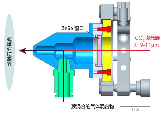 圖 3. 用于激光 CVD 工藝的光學耦合氣體噴嘴示意圖,氣體通過側向端口進入,紅外激光通過 ZnSe 窗口沿軸向進入。