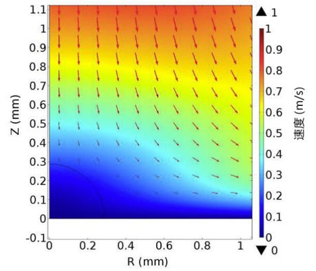 圖 4. L-CVD 的速度和溫度場仿真。上:從直徑 3 mm 的噴嘴中流出的 L-CVD 前體流動速度等值線,以及由于空氣玻璃界面處激光加熱誘發的溫度場。下:汽化石英的速度流線,在左下角可以看到以擴散為主的玻璃傳遞(深藍色)。