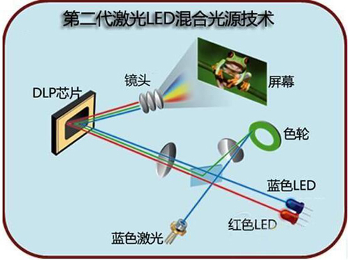 激光+LED混合光源技術是將紅(高亮度紅色LED)、綠(藍色激光通過熒光體轉換為綠色)、藍(藍色激光)三色,通過DLP芯片投影,即可以不使用高壓水銀燈泡而實現高亮度投影。激光+LED新光源集合這兩種光源壽命長、色域廣的特點于一身,在長時間內亮度衰減不明顯,能較長時間保持鮮艷的影像品質,減少了維護成本和使用成本,現階段主要應用在商務和教育領域。就現階段而言,三基色純激光、熒光粉+藍光、LED+激光三項激光顯示技術將會共存一段時間。