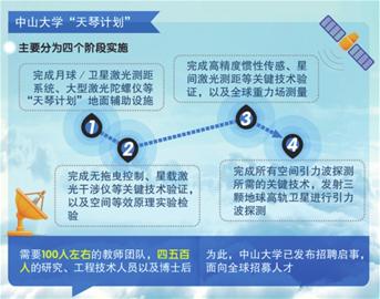 據介紹,中山大學“天琴計劃”以引力波研究為中心,開展空間引力波探測計劃任務的預先研究,制定中國空間引力波探測計劃的實施方案和路線圖,并開展關鍵技術研究。主要分為四個階段實施:第一階段,完成月球/衛星激光測距系統、大型激光陀螺儀等“天琴計劃”地面輔助設施;第二階段,完成無拖曳控制、星載激光干涉儀等關鍵技術驗證,以及空間等效原理實驗檢驗;第三階段,完成高精度慣性傳感、星間激光測距等關鍵技術驗證,以及全球重力場測量;第四階段,完成所有空間引力波探測所需的關鍵技術,發射三顆地球高軌衛星進行引力波探測。